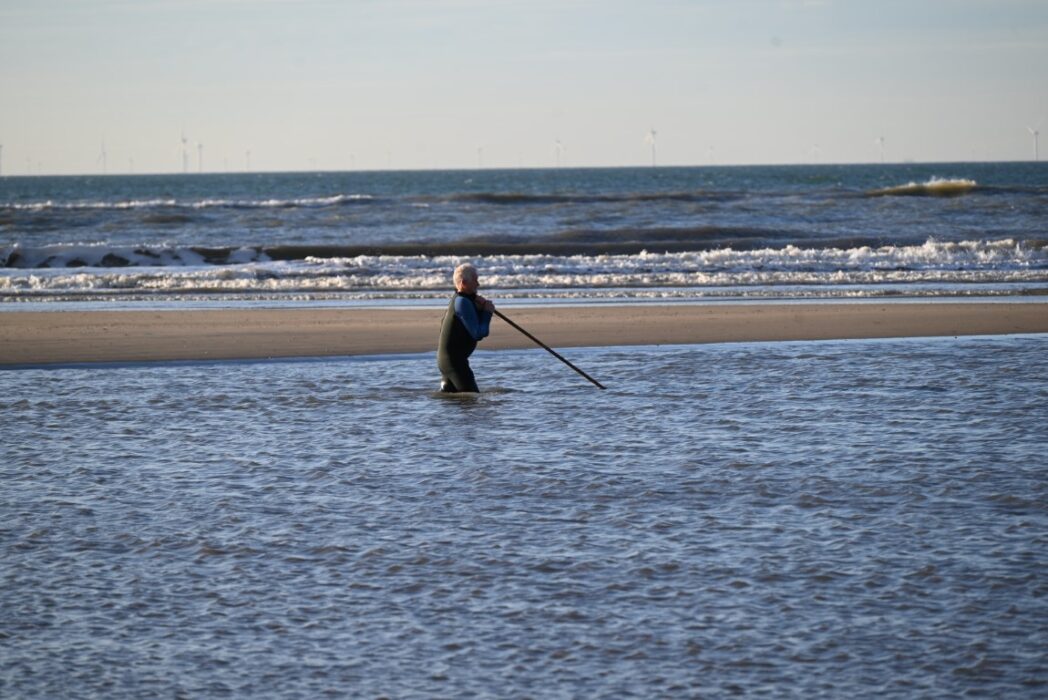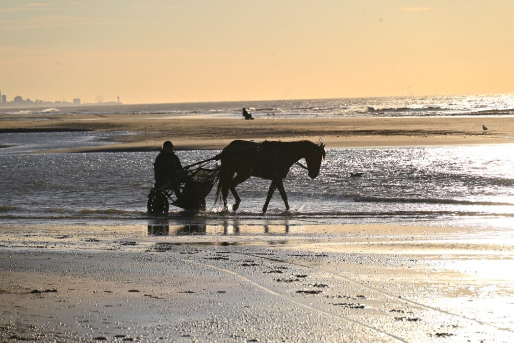 Het strand geeft buiten het seizoen toch altijd een bepaalde rust. Ook de garnalenvisser liep rustig door de zee.