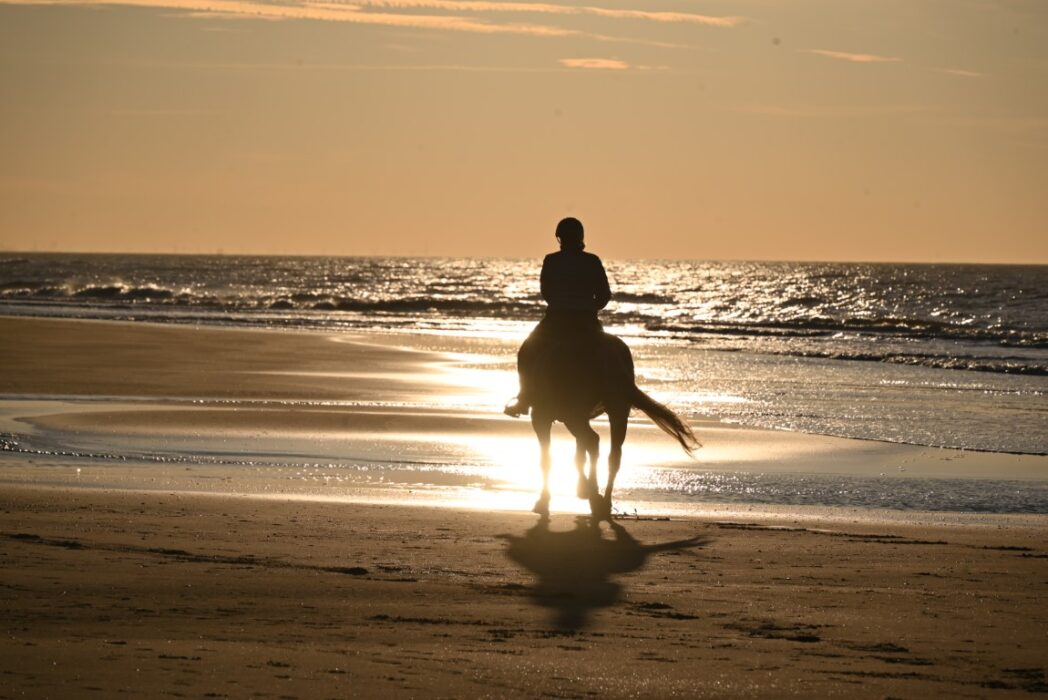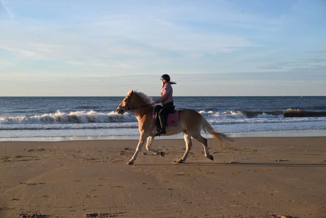 Een paardje in galop kwam het strand op. Tja het is rijmtijd.