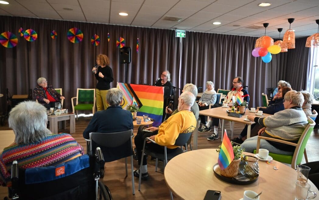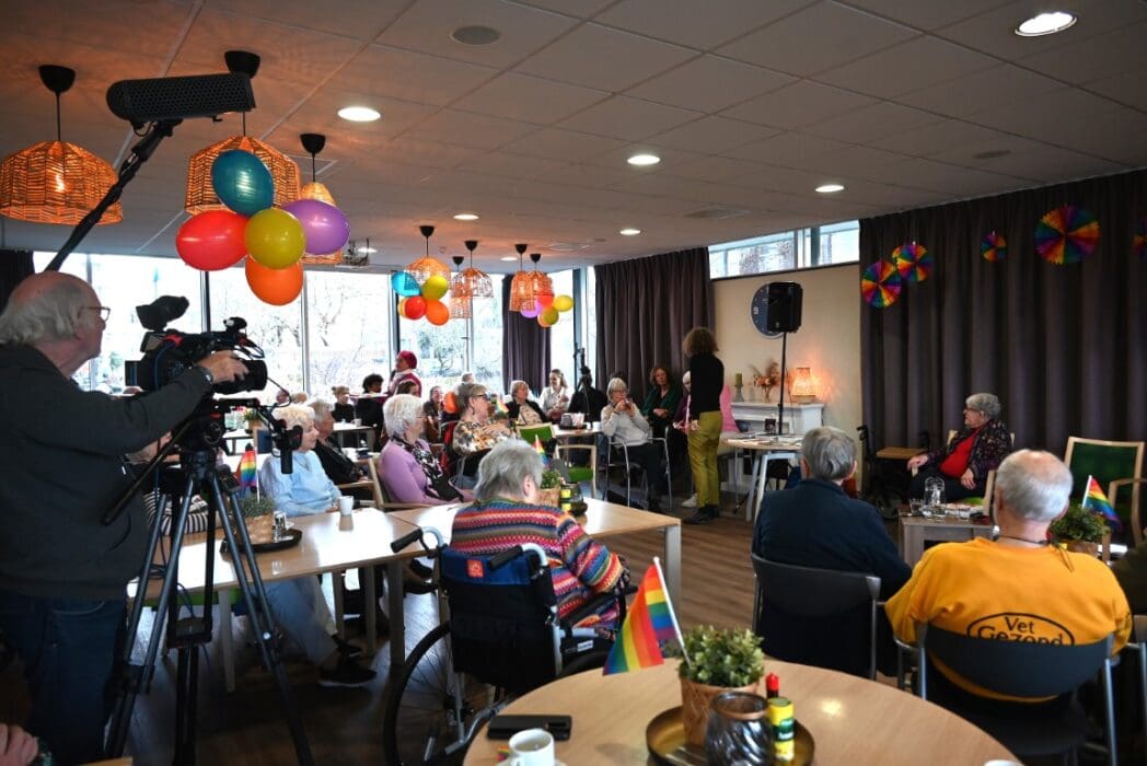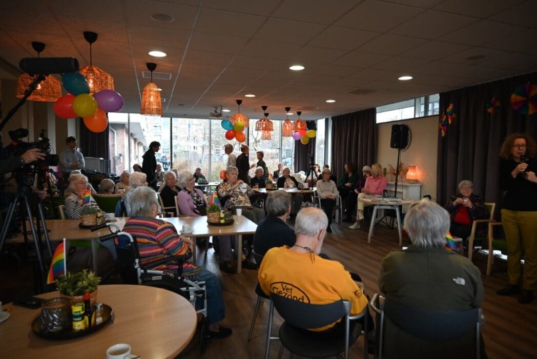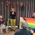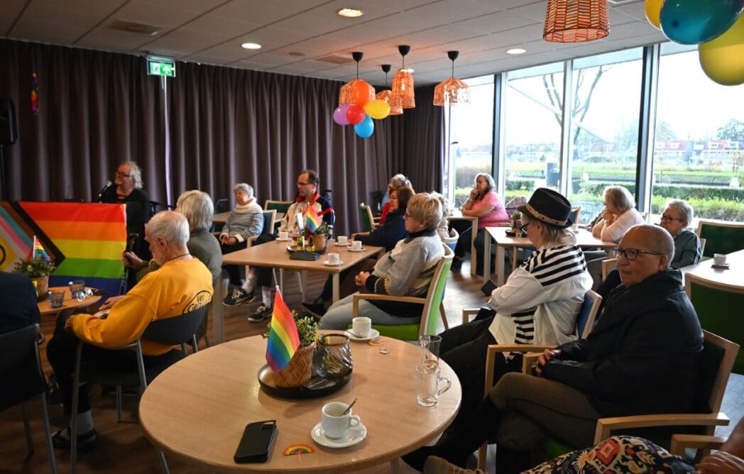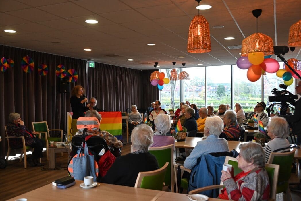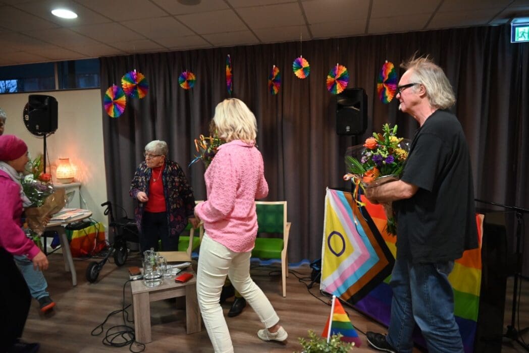 De zaal zat goed vol en de versiering in regenboogkleuren gaf aan om wat voor middag het ging.