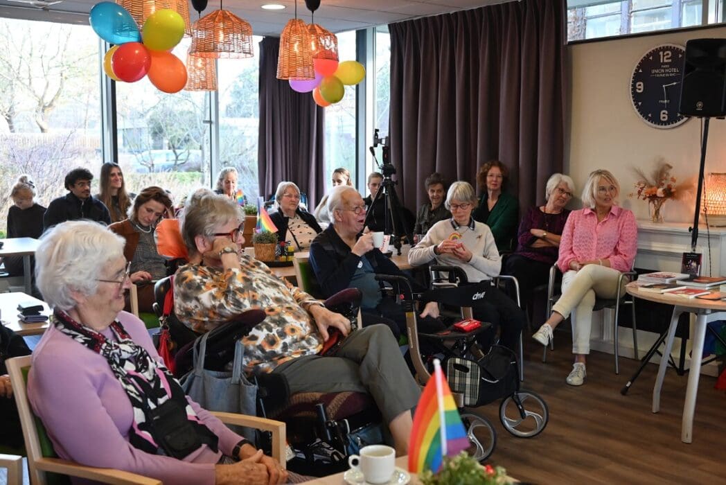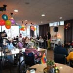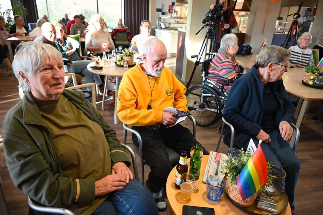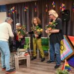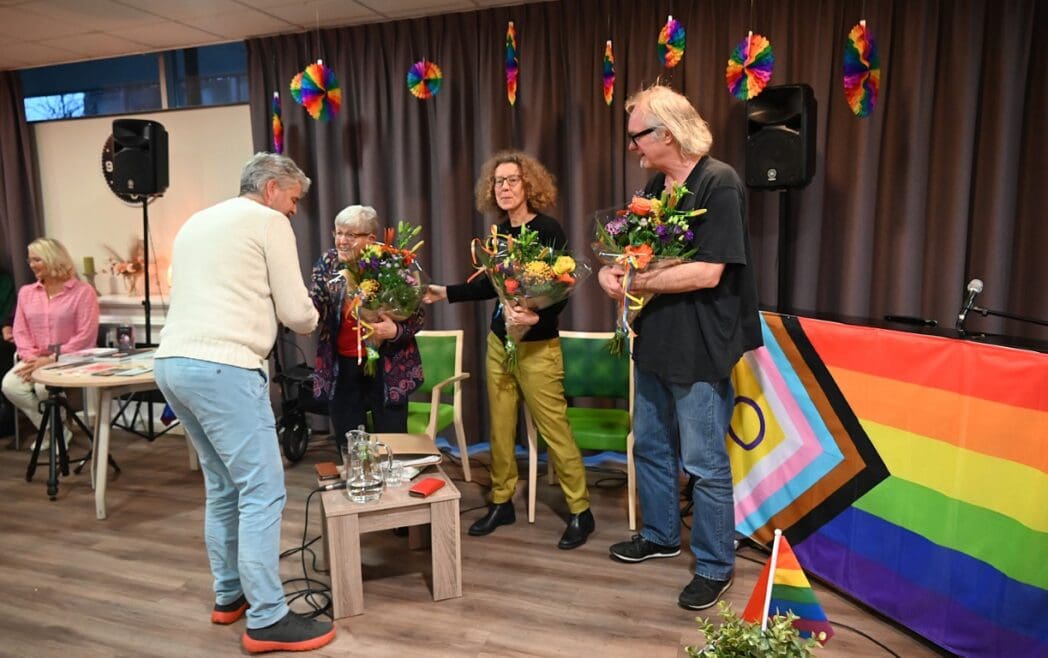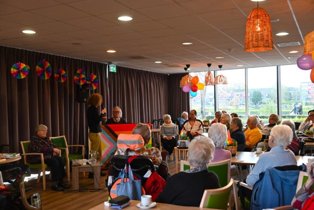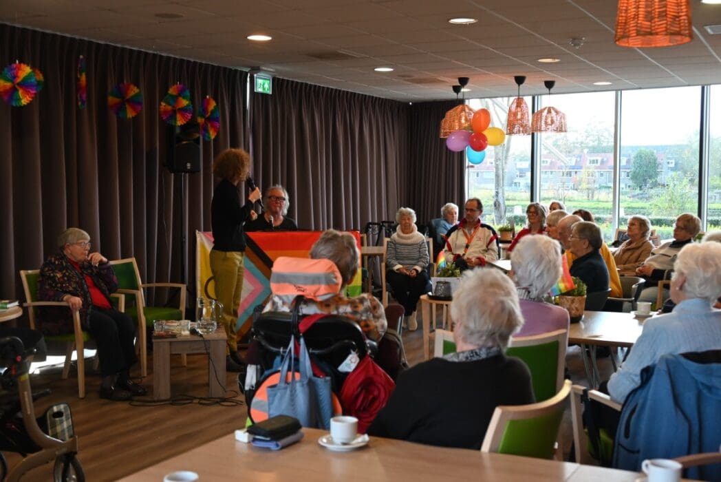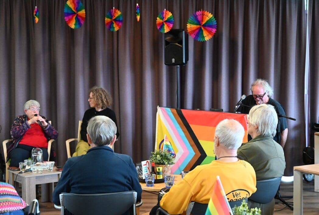 De zaal zat goed vol en de versiering in regenboogkleuren gaf aan om wat voor middag het ging.