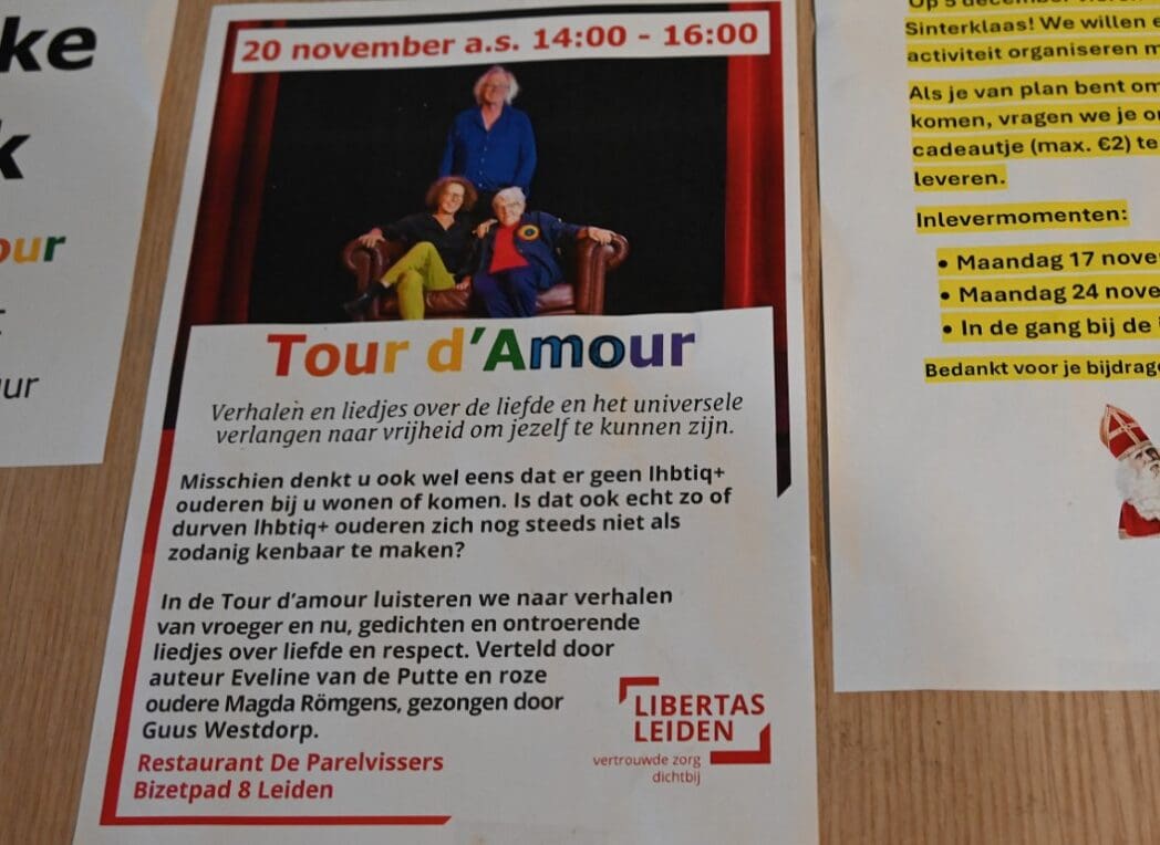 Tour d’Amour is in 2014 ontstaan om LHBTI-mensen (lesbisch, homoseksueel, biseksueel, transgender en interseksueel) de mogelijkheid te bieden voor hun geaardheid uit te komen. Nog steeds zijn er veel mensen die niet voor hun geaardheid uit durven komen en hun ‘geheim’ zelfs meenemen als ze naar een verzorgingshuis gaan en er daar ook niet over durven praten. De bedoeling van Tour d’Amour is om het wel bespreekbaar te maken in de verzorgingshuizen. Afgelopen week kwam de Tour op initiatief van Libertas Leiden bij Zorgcentrum de Parelvissers.
