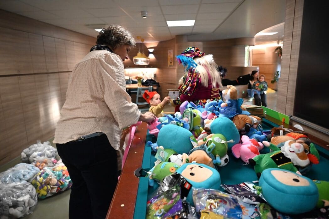 Het biljart lag vol met cadeautjes, voor elk kind een pluche beest of pop en een boekje.