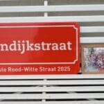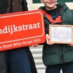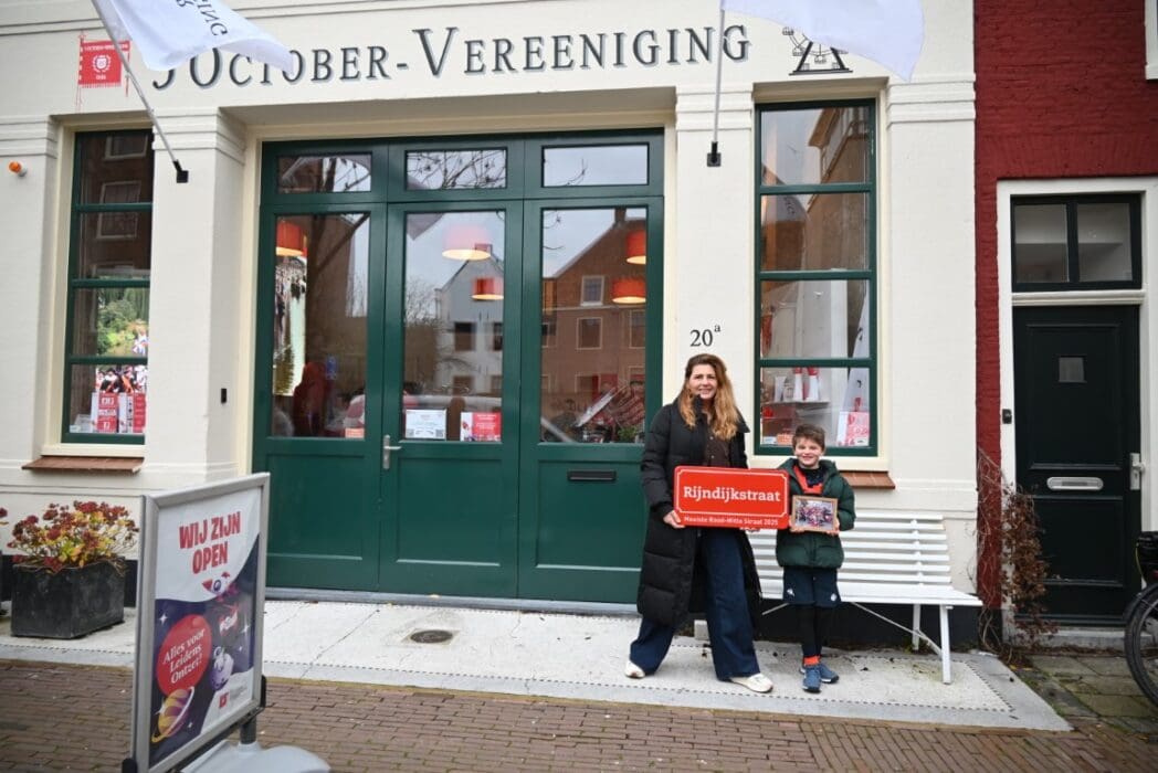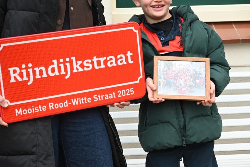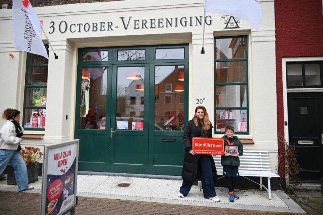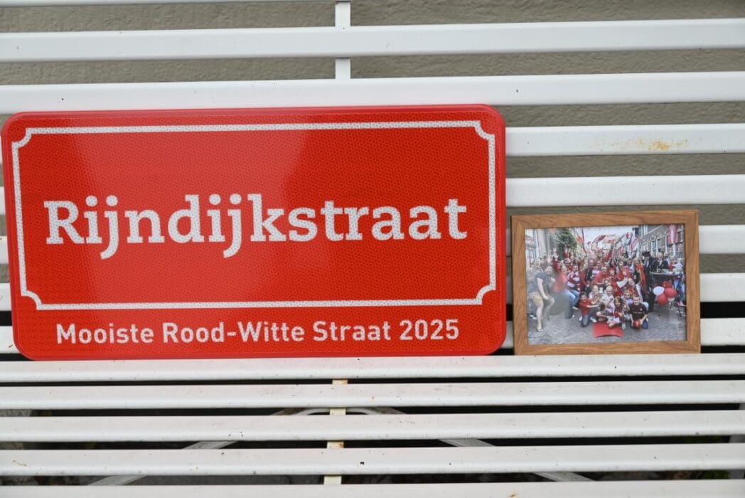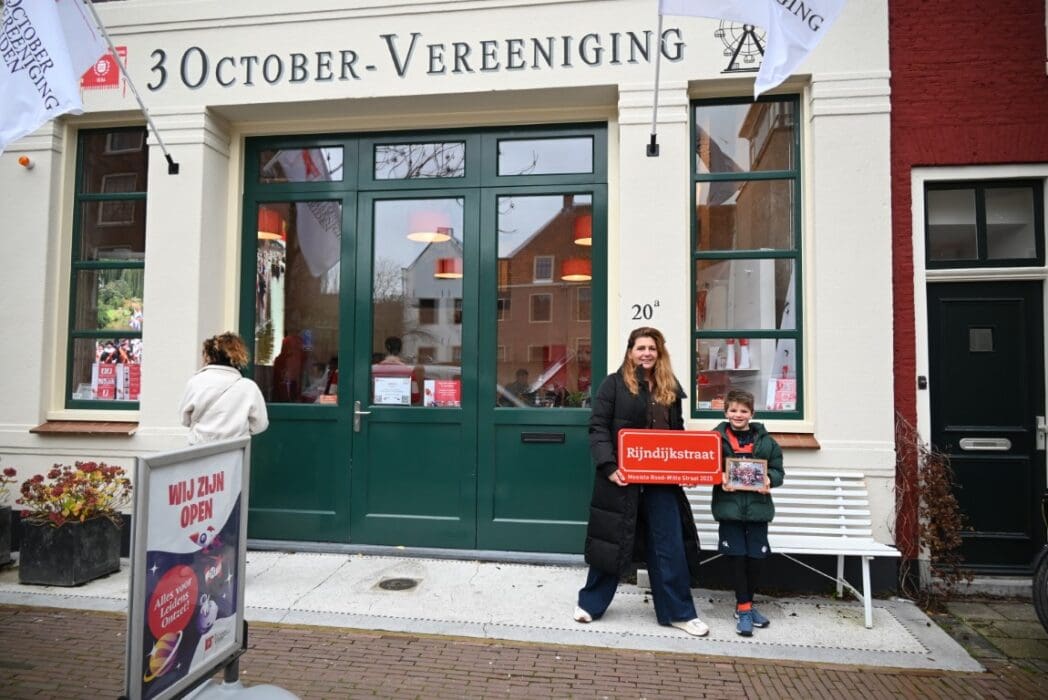Dit jaar was de Rijndijkstraat de mooist versierde straat in aanloop naar 3 October. Een bewoner van de straat kwam het straatnaambord zaterdag ophalen.
