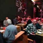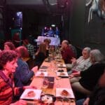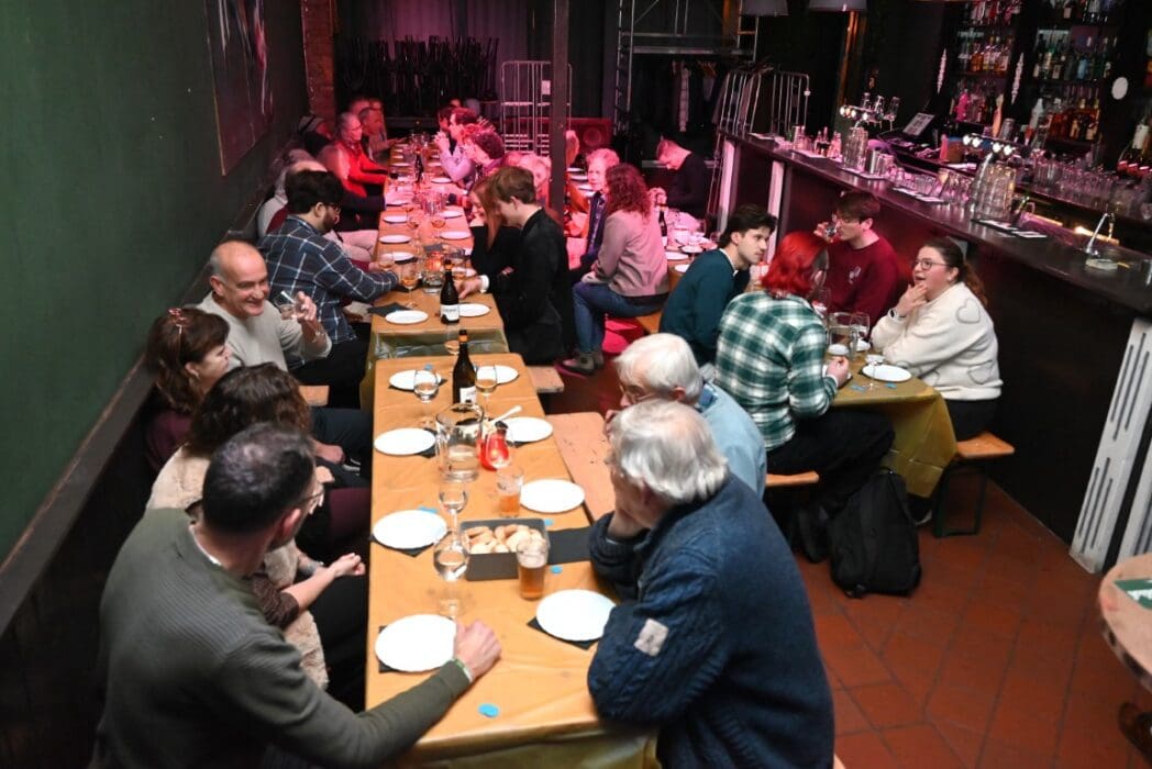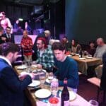 Mooi gezicht zo’n groot gezelschap dat elkaar niet kent gezellig aan het eten.