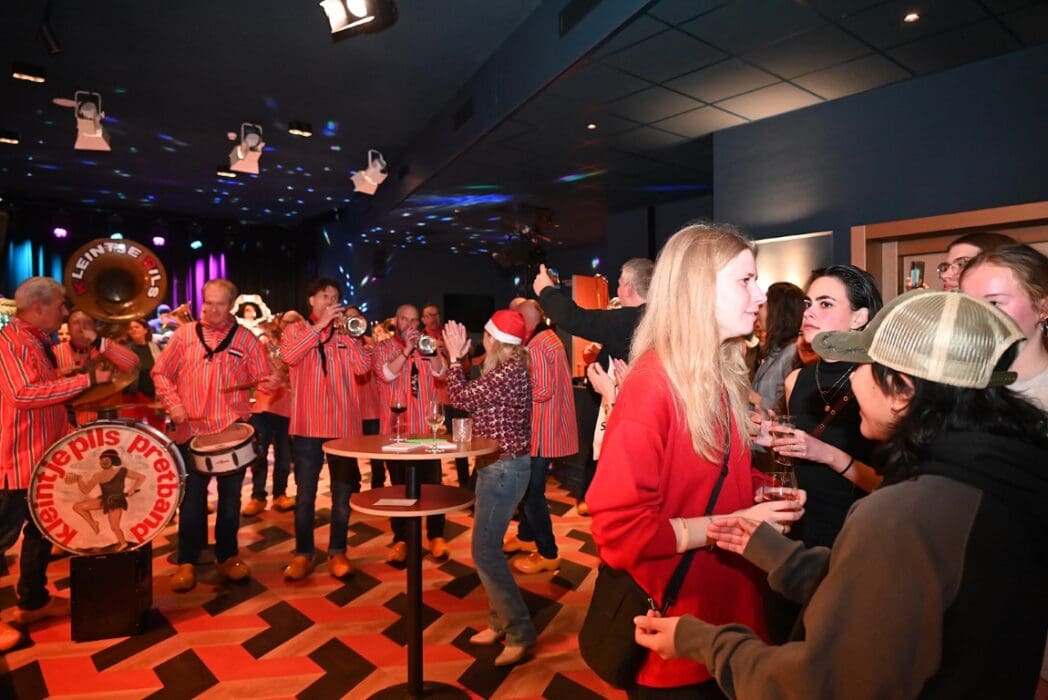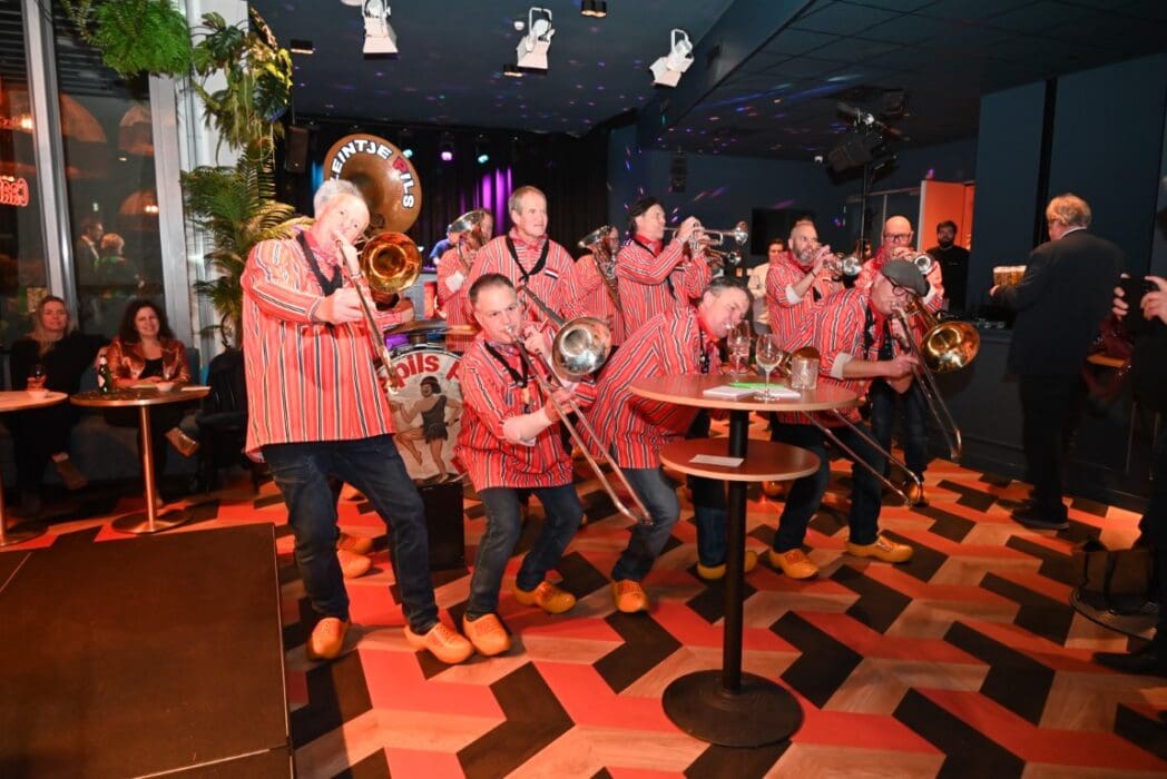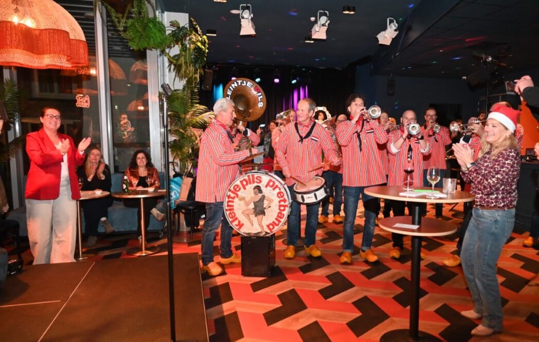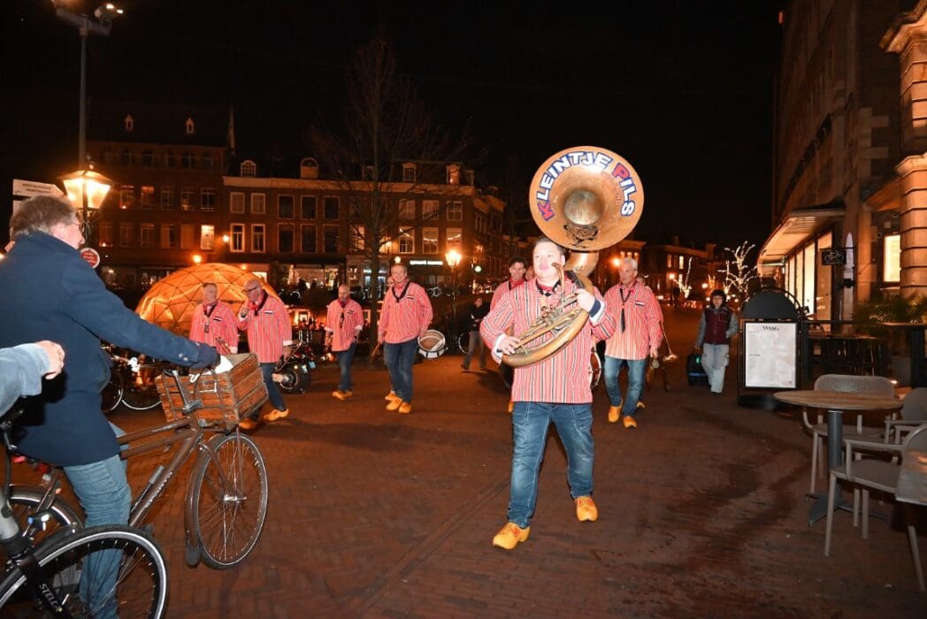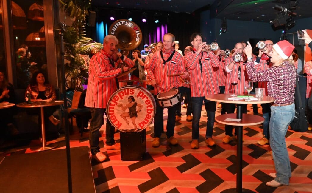 Kleintje Pils had op de Drijvende IJsbaan gespeeld tijdens een benefiet voor het Willem Alexander Kinderziekenhuis. Afgelopen week belde ik grote tromspeler Ruud Bakker en vroeg of Kleintje Pils zin had na de ijsbaan nog even op het afscheid van Yvonne van Delft te spelen. Hij was er gelijk voor in en zou het de rest van de band nog even vragen. En zo liep ik dus met de band achter me aan van de ijsbaan naar Café Caat. Voorbijgangers stonden raar te kijken, wat doet een blaasorkest om 21 uur ’s avonds in het centrum 🙂