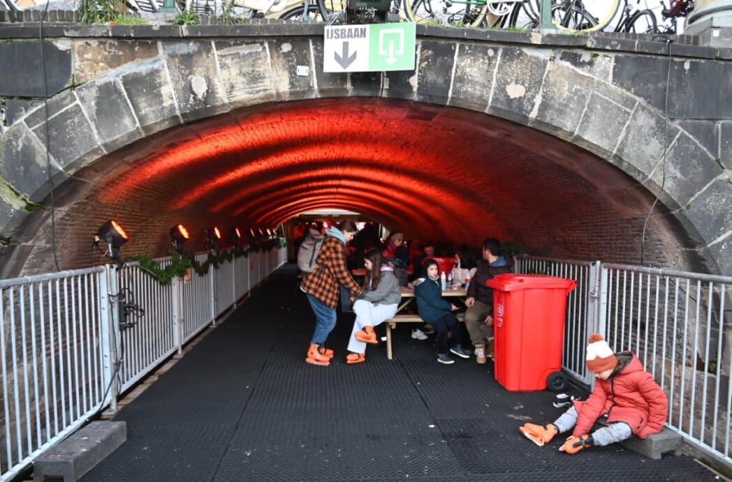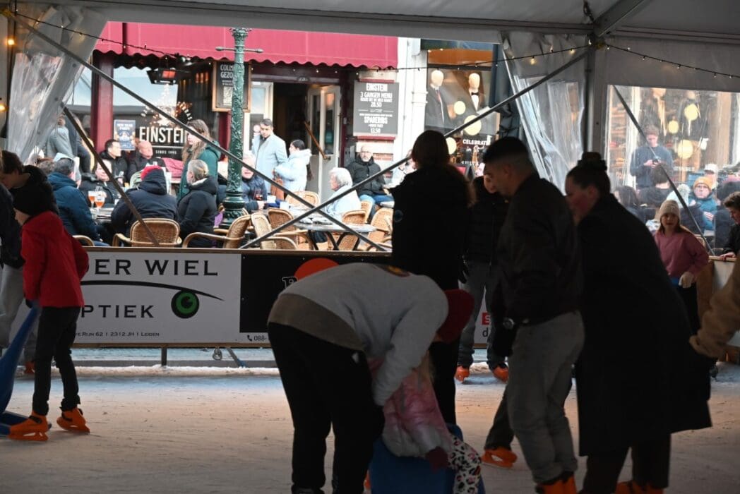 Het is natuurlijk heerlijk om vanaf het terras naar het schaatsen te kijken. Het blijft toch heel apart om onder de Koornbeursbrug op het water van de Nieuwe Rijn je schaatsen aan te trekken.