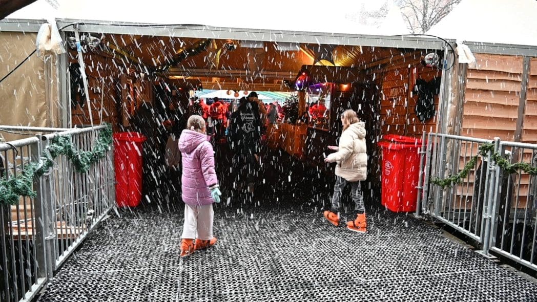 Die overkapping heeft een voor- en een nadeel. Je schaatst lekker droog, maar je moet wel het dak sneeuwvrij houden omdat het anders te zwaar wordt. Daarom werd de sneeuw eraf gespoten.