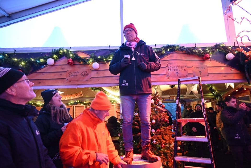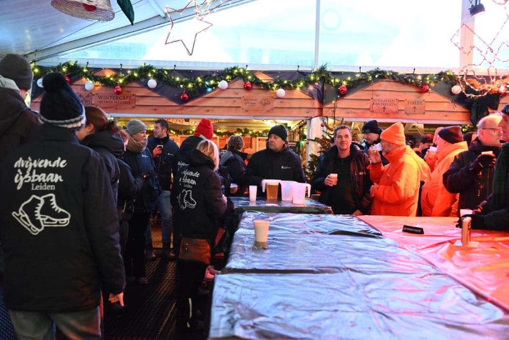 Even na half vijf kwam een groot deel van de vrijwilligers samen om, voor ze gingen afbreken, vast te proosten op het succes van de ijsbaan.