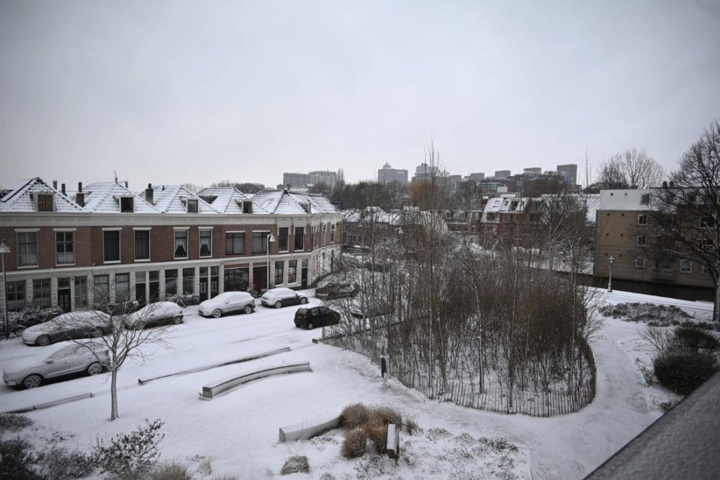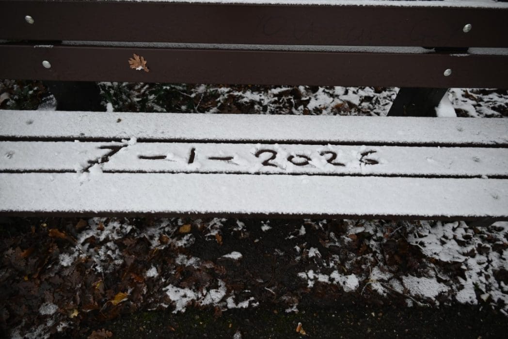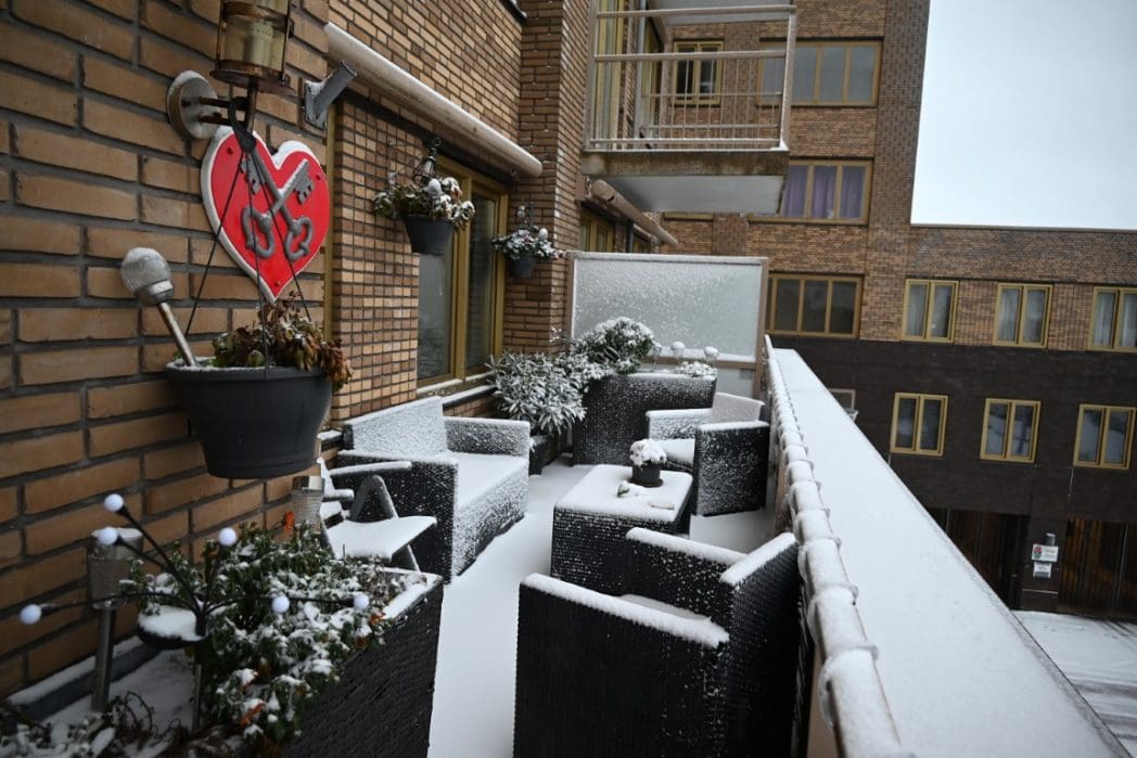 Ik was, voor mijn doen, vroeg op in de hoop van de sneeuw te kunnen genieten voor het ging regenen. Eerst maar even een foto maken van het balkon.