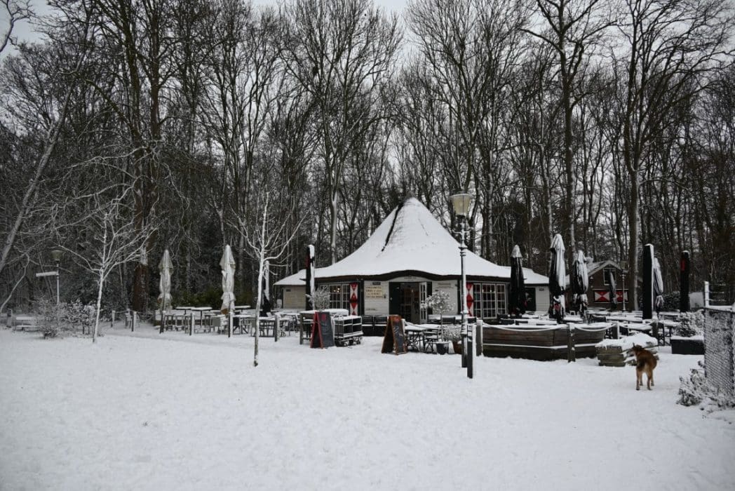 Binnen was het al gezellig vol met koffiedrinkers, snap niet dat ze niet even buiten gingen zitten om van de sneeuw te genieten.