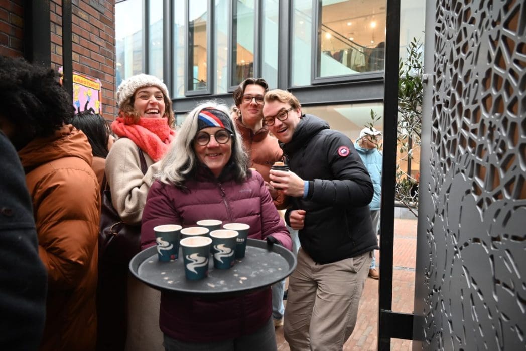 Net zoals gisteren werd er weer warme chocomel uitgedeeld. Leden van Studentenpartij SVL deden zich tegoed aan de chocomel.