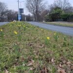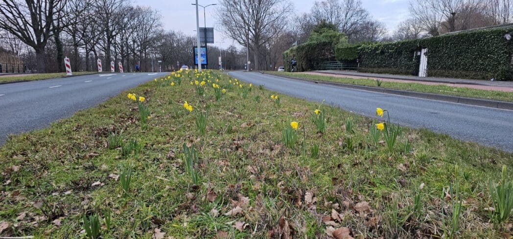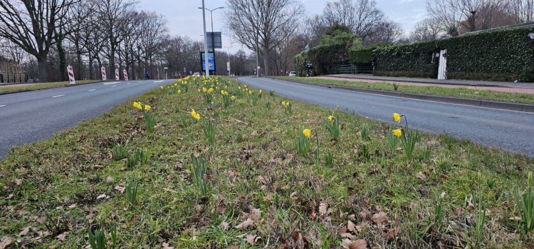Maar toch als je zo’n middenberm vol met narcissen ziet en een klein zonnetje erbij, vergeet je de even de kou en denkt aan het voorjaar.