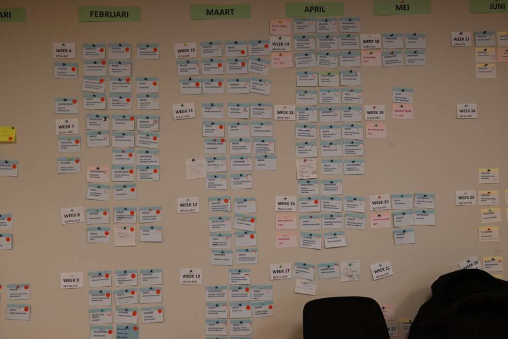 Nieuwe vrijwilligers stonden versteld van het planbord, waar precies op staat wat er op welke datum moet gebeuren of klaar zijn.