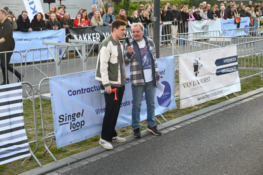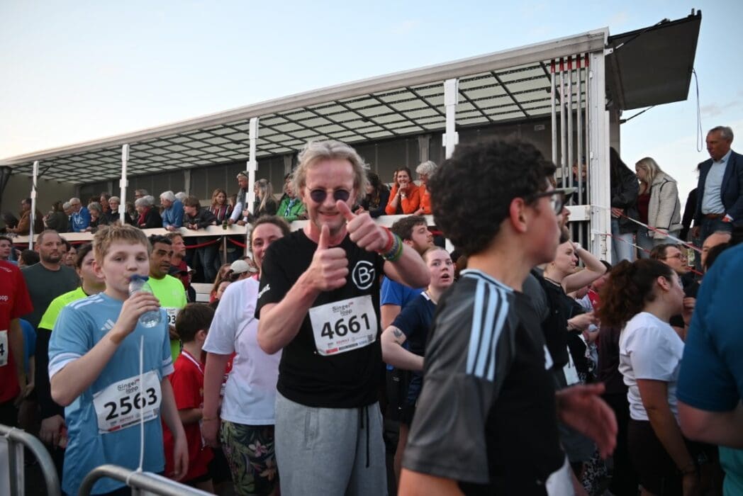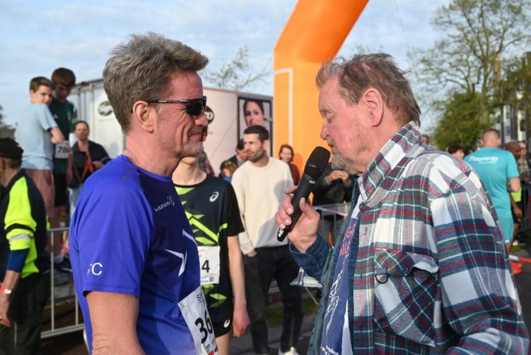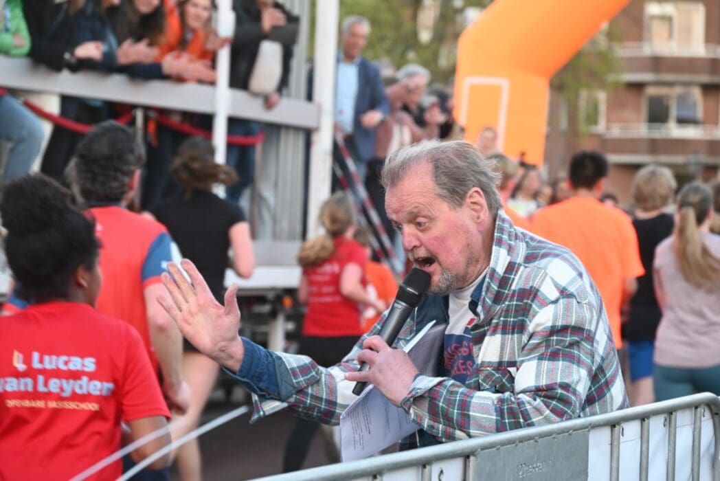 Teun de Reede, zelf loper en al jaren speaker bij de Singelloop en andere loopevenementen was weer helemaal op dreef om het publiek en de lopers op te warmen.