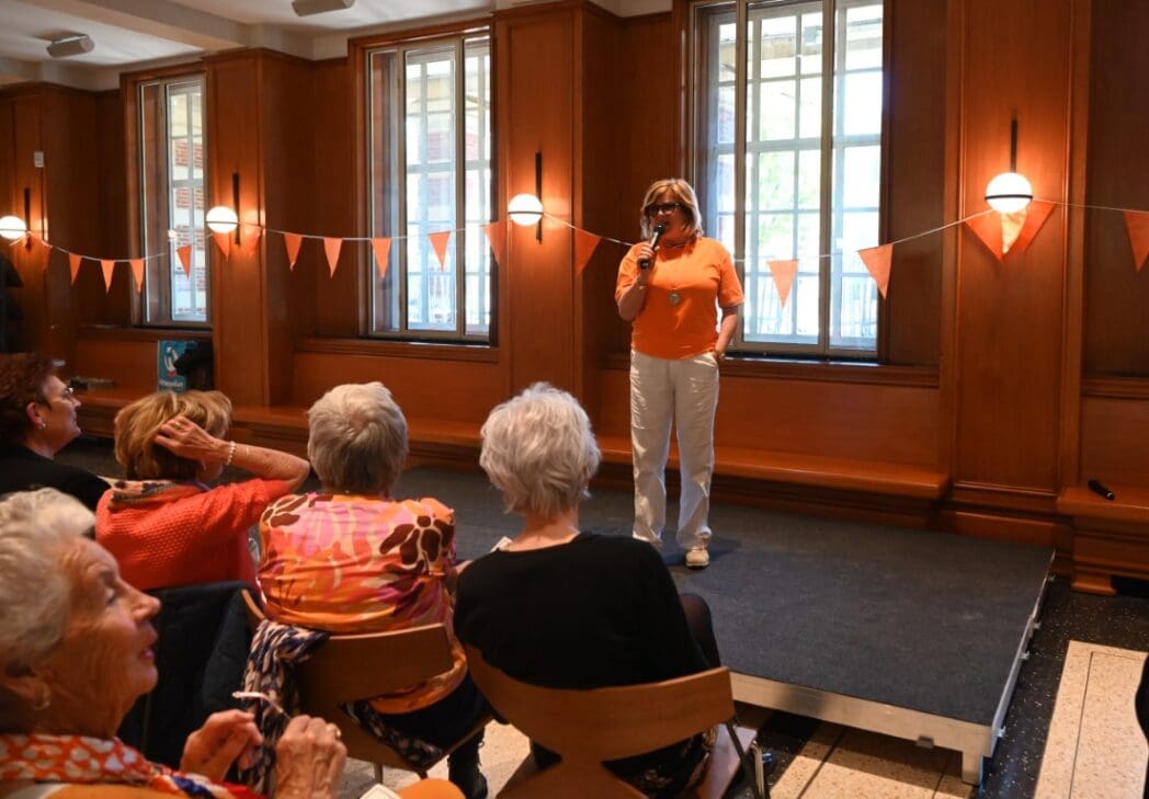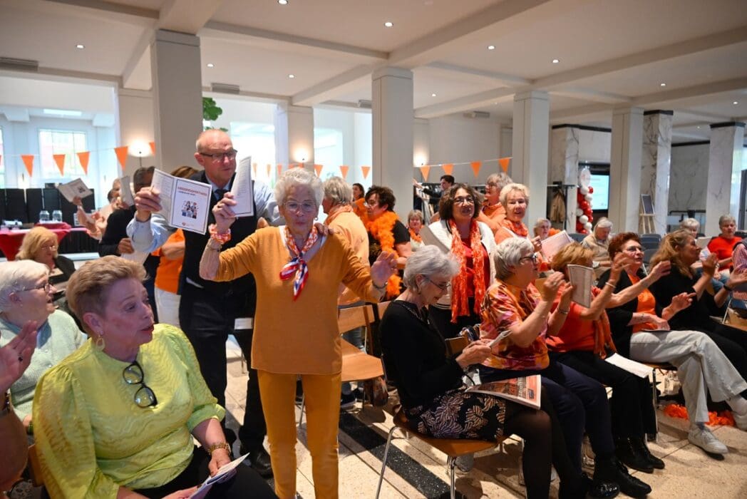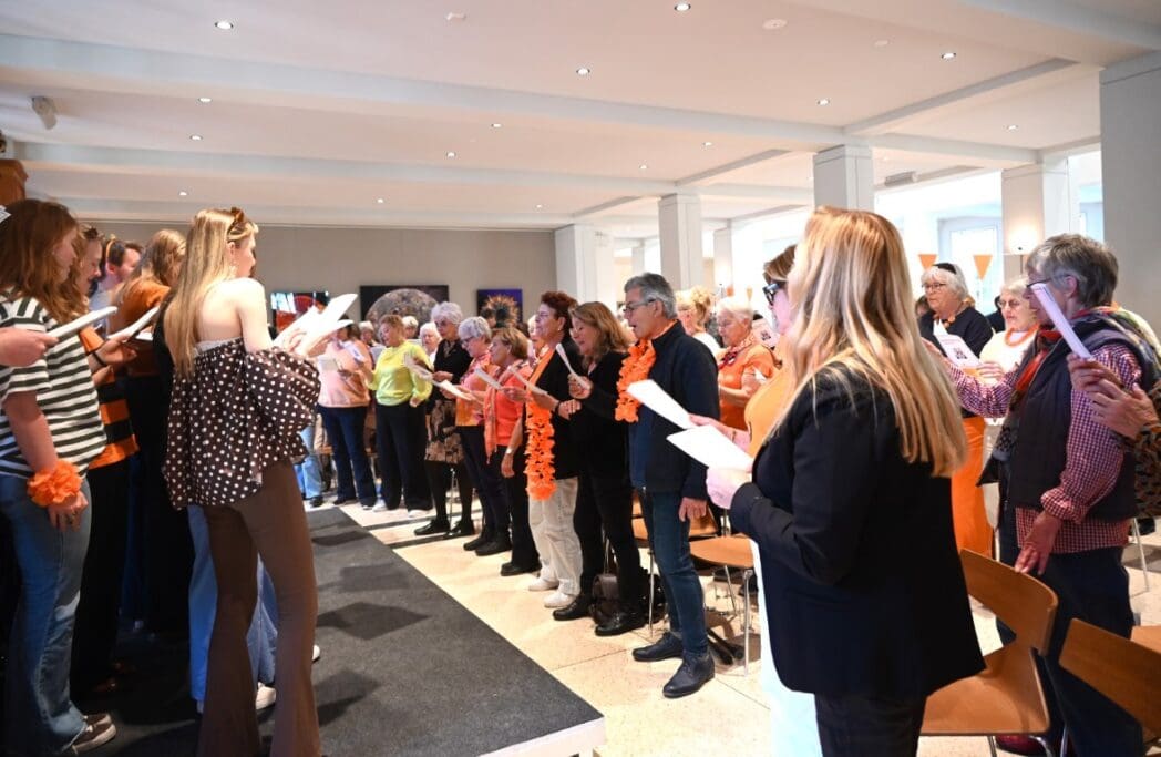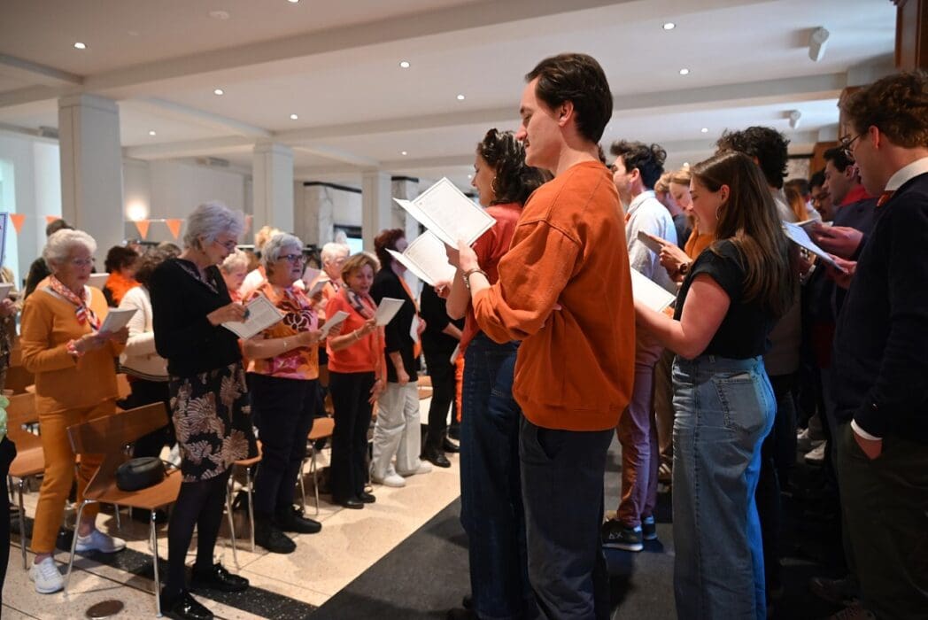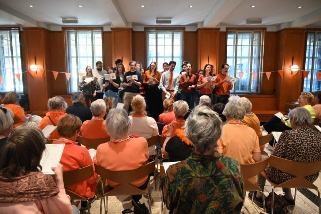 Trudy Kwik, voorzitter Oranje Vereniging Leiden heette iedereen welkom en vroeg zich af waar de mannen waren. Op een paar mannen na, waren voornamlijk dames komen zingen 🙂