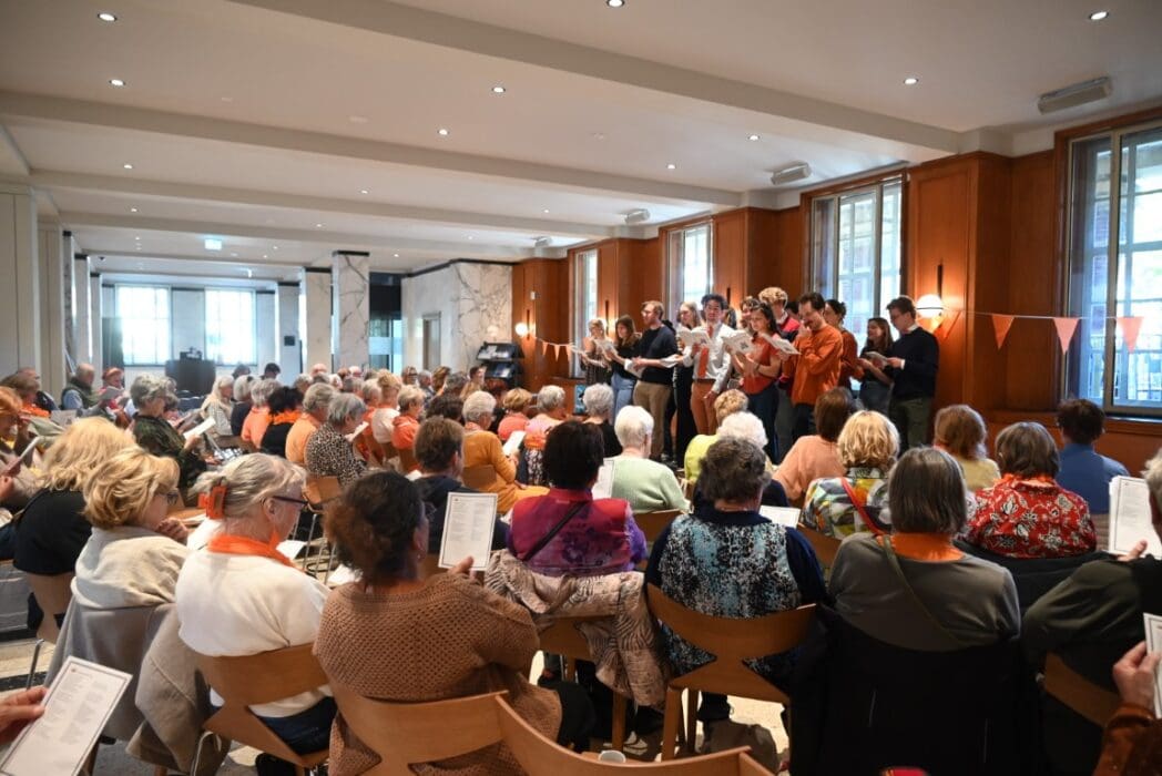 In de week voor Koningsdag zijn er diverse feestjes, vanmiddag was het senioren Meezingspektakel in de Foyer van het Stadhuis. Het Minerva studentenkoor Sempre Cresendo zingt normaal klassieke muziek, maar eens per jaar zingen ze tegenwoordig Hollandse klassiekers tijdens het Meezingspektakel.
